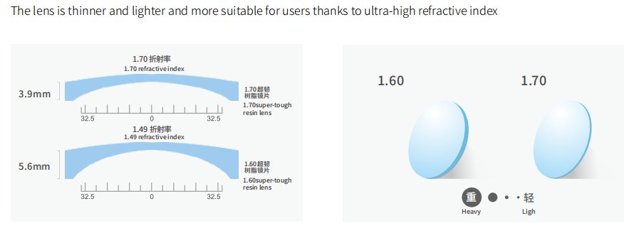 Allyl diglycol dicarbonate, which is the common CR-39 material now, was originally developed by PPG in the United States in the 1940s and gradually applied to eyeglass lens materials, improving the fragility of glass materials. CR-39 lenses have a high Abbe number, excellent optical performance, and a refractive index of 1.49. They have become the most widely used material in low refractive index lenses. Usually, at the same degree, the lower the refractive index of the lens, the thicker the lens. The CR-39 lens with a refractive index of only 1.49 will inevitably cause consumers to wear heavy problems, so seeking higher refractive index lens materials has become the focus of subsequent research.
